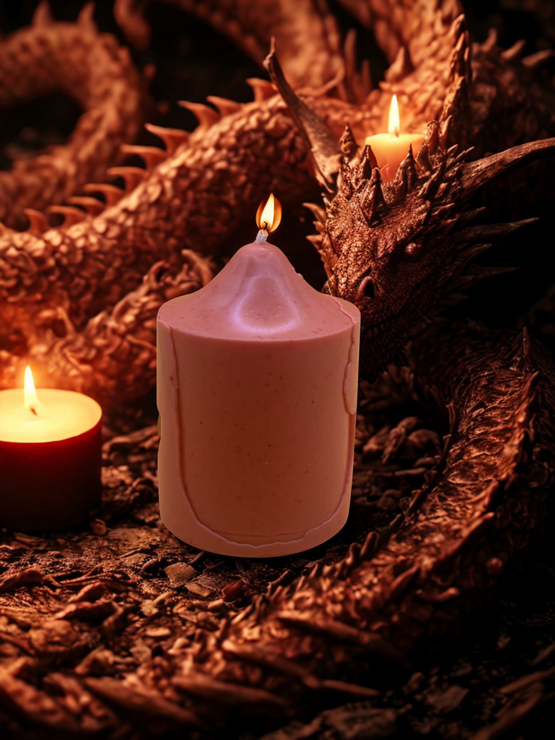A short, tipped pillar candle with a deep, sultry, spicy floral-citrus fragrance with a mulled orange rind top-note, a floral heart of geranium, rose, lily, orange blossom and star anise, finishing with a heavy, powdery vanilla-musk, spicy clove and patchouli dry-down